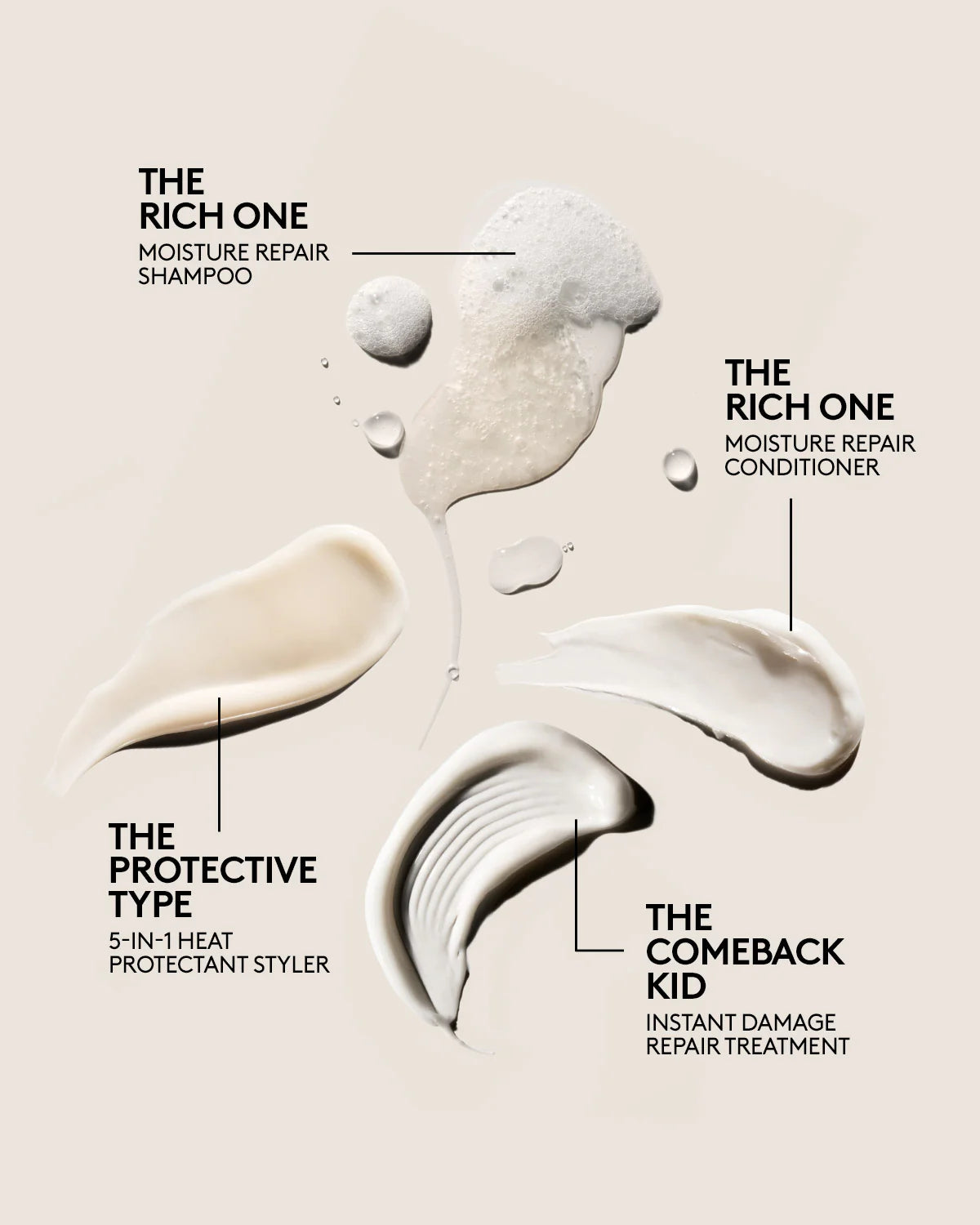 Bundle includes: The Rich One Shampoo: 300mL | The Rich One Conditioner: 300mL | The Comeback Kid: 150mL | The Protective Type: 150mL